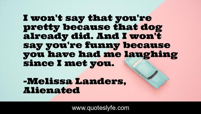 This page presents the quote "I won't say that you're pretty because that dog already did. And I won't say you're funny because you have had me laughing since I met you.". Author of this quote is Melissa Landers, Alienated. This quote is about cute, comedy, funny, sweet,.