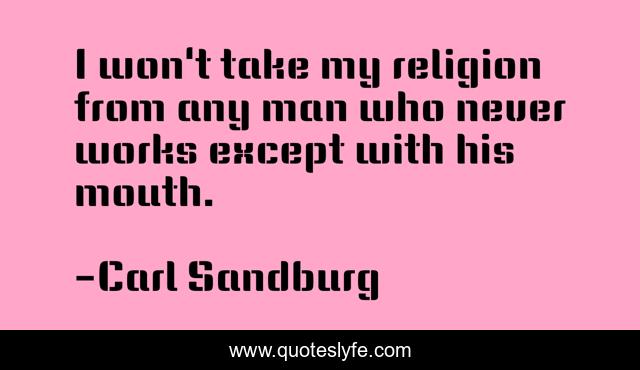 This page presents the quote "I won't take my religion from any man who never works except with his mouth.". Author of this quote is Carl Sandburg. This quote is about mouth, man,.