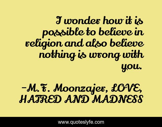 This page presents the quote "I wonder how it is possible to believe in religion and also believe nothing is wrong with you.". Author of this quote is M.F. Moonzajer, LOVE, HATRED AND MADNESS. This quote is about possible, athiesm, religion, wrong, believe, wonder,.