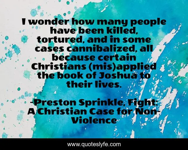 This page presents the quote "I wonder how many people have been killed, tortured, and in some cases cannibalized, all because certain Christians (mis)applied the book of Joshua to their lives.". Author of this quote is Preston Sprinkle, Fight: A Christian Case for Non-Violence. This quote is about bible, theology,.
