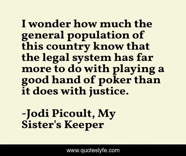 This page presents the quote "I wonder how much the general population of this country know that the legal system has far more to do with playing a good hand of poker than it does with justice.". Author of this quote is Jodi Picoult, My Sister's Keeper. This quote is about life, justice-system, justice, reality-of-life, reality, legal-system, inspirational, enthusiasm,.