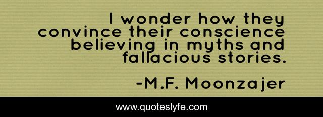 This page presents the quote "I wonder how they convince their conscience believing in myths and fallacious stories.". Author of this quote is M.F. Moonzajer. This quote is about conscience, myths, convince, wonder,.