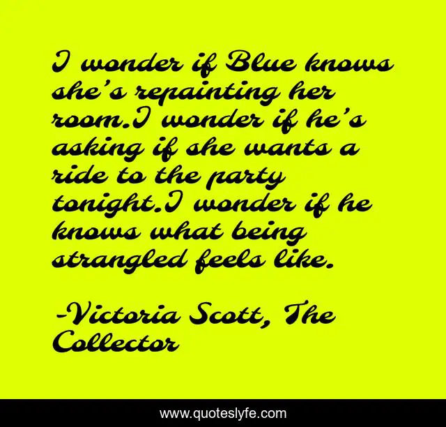 This page presents the quote "I wonder if Blue knows she’s repainting her room.I wonder if he’s asking if she wants a ride to the party tonight.I wonder if he knows what being strangled feels like.". Author of this quote is Victoria Scott, The Collector. This quote is about blue, dante-walker, jealousy,.
