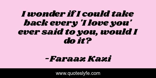 This page presents the quote "I wonder if I could take back every 'I love you' ever said to you, would I do it?". Author of this quote is Faraaz Kazi. This quote is about love, heartbreak, tragic, sad-love, affection,.