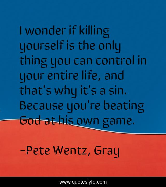 This page presents the quote "I wonder if killing yourself is the only thing you can control in your entire life, and that's why it's a sin. Because you're beating God at his own game.". Author of this quote is Pete Wentz, Gray. This quote is about life, suicide,.
