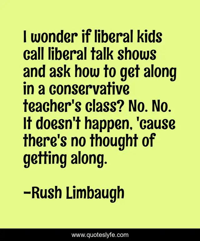 This page presents the quote "I wonder if liberal kids call liberal talk shows and ask how to get along in a conservative teacher's class? No. No. It doesn't happen, 'cause there's no thought of getting along.". Author of this quote is Rush Limbaugh. This quote is about thought, kids, conservative,.