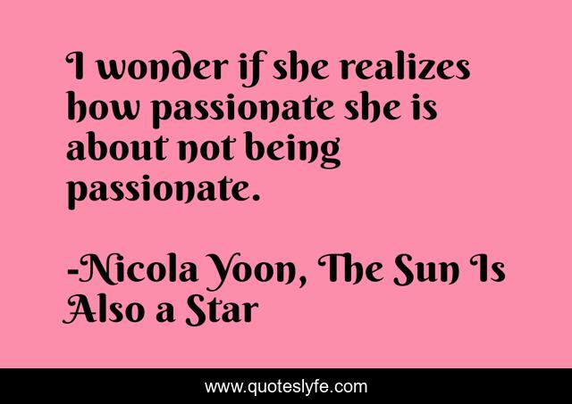 This page presents the quote "I wonder if she realizes how passionate she is about not being passionate.". Author of this quote is Nicola Yoon, The Sun Is Also a Star. .