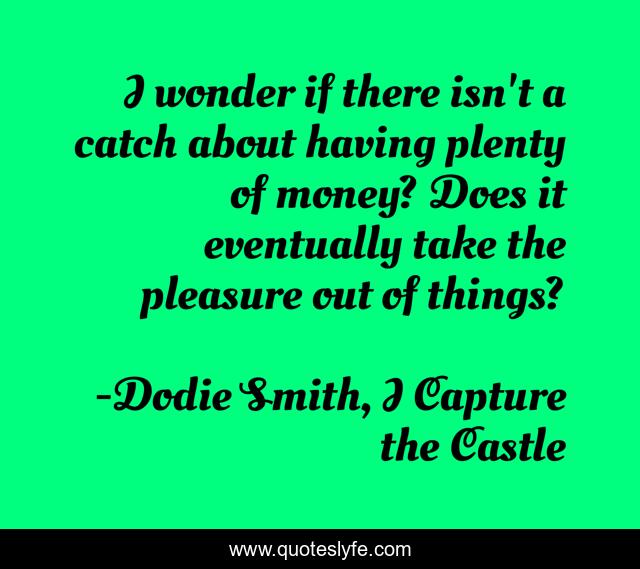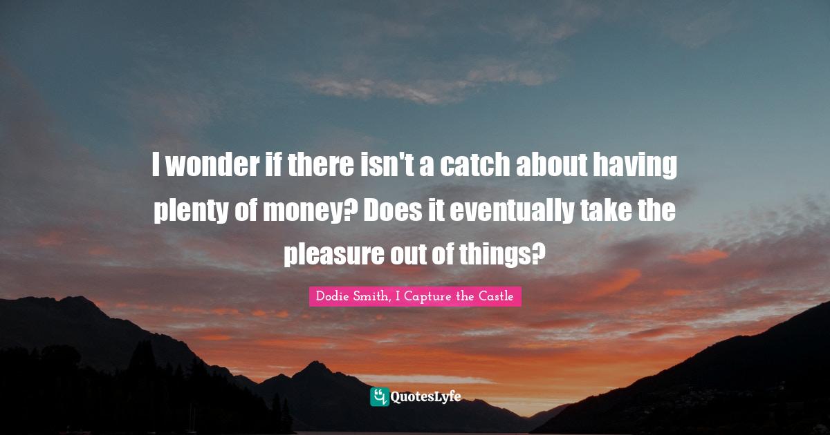 This page presents the quote "I wonder if there isn't a catch about having plenty of money? Does it eventually take the pleasure out of things?". Author of this quote is Dodie Smith, I Capture the Castle. .