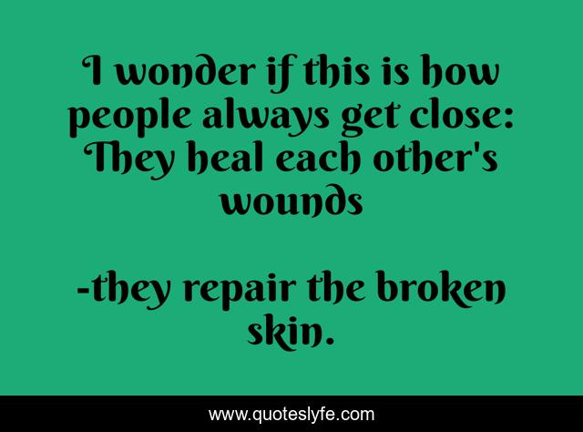 This page presents the quote "I wonder if this is how people always get close: They heal each other's wounds". Author of this quote is they repair the broken skin.. This quote is about lauren oliver, pandemonium,.