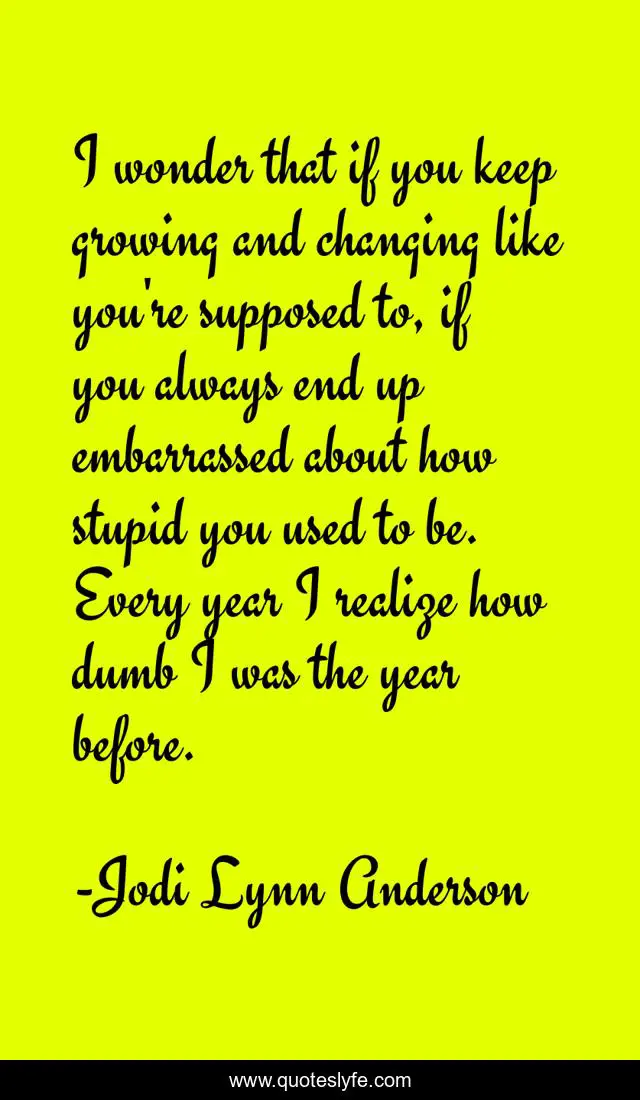 This page presents the quote "I wonder that if you keep growing and changing like you're supposed to, if you always end up embarrassed about how stupid you used to be. Every year I realize how dumb I was the year before.". Author of this quote is Jodi Lynn Anderson. This quote is about growing-up, life-lessons, people,.
