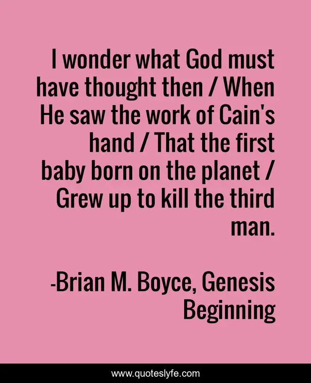 This page presents the quote "I wonder what God must have thought then / When He saw the work of Cain's hand / That the first baby born on the planet / Grew up to kill the third man.". Author of this quote is Brian M. Boyce, Genesis Beginning. This quote is about bible, god, garden-of-eden, cain, abel, genesis,.