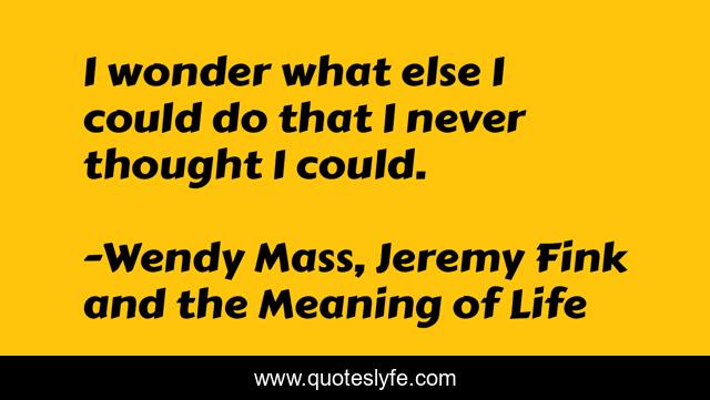 This page presents the quote "I wonder what else I could do that I never thought I could.". Author of this quote is Wendy Mass, Jeremy Fink and the Meaning of Life. This quote is about potential, wonder,.