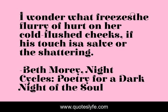 This page presents the quote "I wonder what freezesthe flurry of hurt on her cold-flushed cheeks, if his touch isa salve or the shattering.". Author of this quote is Beth Morey, Night Cycles: Poetry for a Dark Night of the Soul. This quote is about love, relationship, romance, sadness, woman-and-man, cold, affection,.