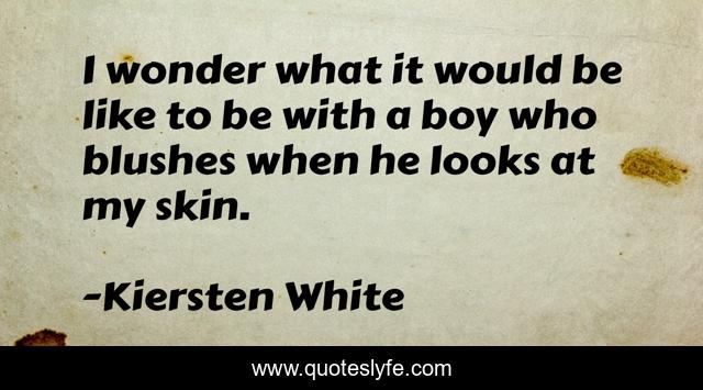 This page presents the quote "I wonder what it would be like to be with a boy who blushes when he looks at my skin.". Author of this quote is Kiersten White. .