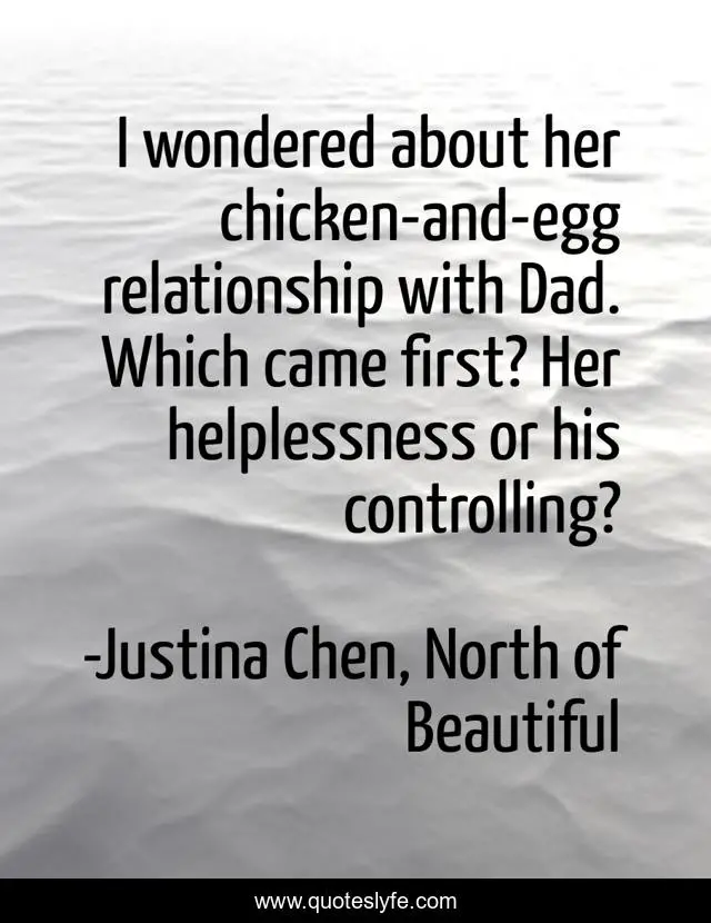 "Justina Chen, North of Beautiful Quotes." Quoteslyfe.com, 2025. Mon. 08 Dec. 2025. <https://www.quoteslyfe.com/quote/I-wondered-about-her-chicken-and-egg-210173>.