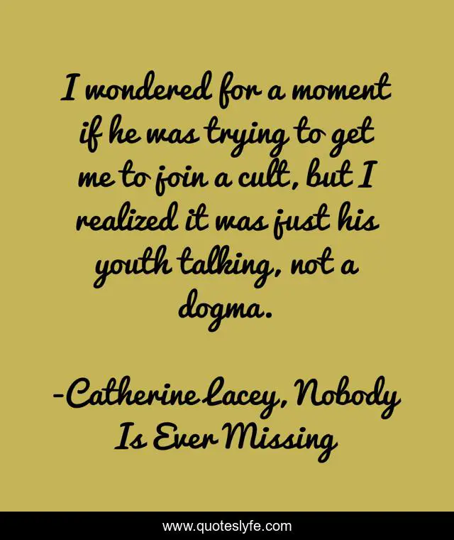 This page presents the quote "I wondered for a moment if he was trying to get me to join a cult, but I realized it was just his youth talking, not a dogma.". Author of this quote is Catherine Lacey, Nobody Is Ever Missing. This quote is about youth, catherine-lacey, humor, nobody-is-ever-missing,.