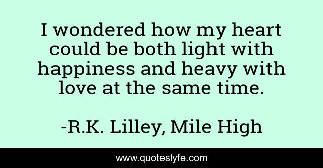 This page presents the quote "I wondered how my heart could be both light with happiness and heavy with love at the same time.". Author of this quote is R.K. Lilley, Mile High. This quote is about heavy, love, mile-high, light, happiness, affection,.