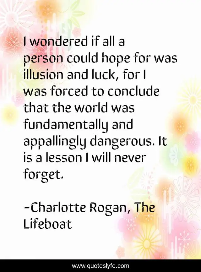 This page presents the quote "I wondered if all a person could hope for was illusion and luck, for I was forced to conclude that the world was fundamentally and appallingly dangerous. It is a lesson I will never forget.". Author of this quote is Charlotte Rogan, The Lifeboat. .