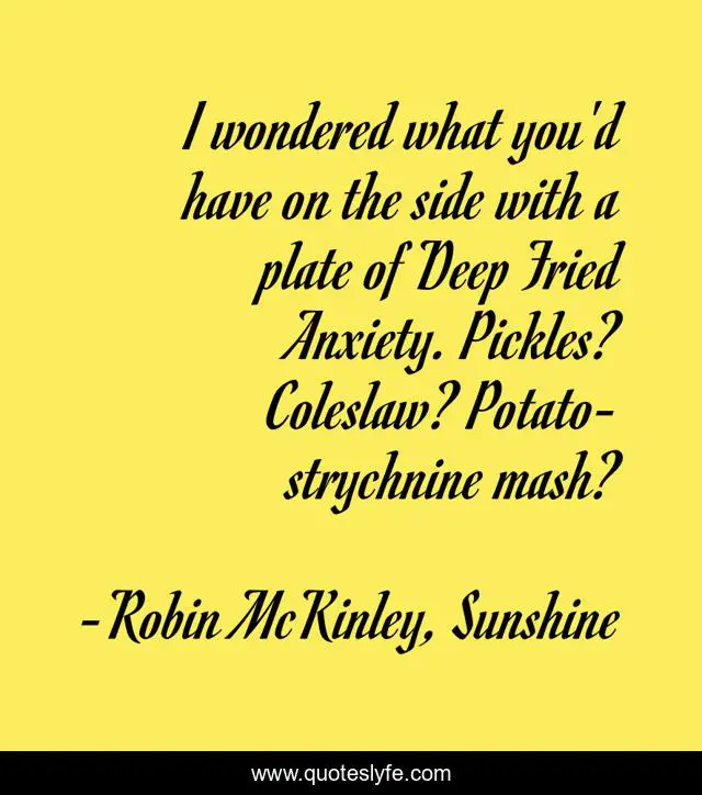 This page presents the quote "I wondered what you'd have on the side with a plate of Deep Fried Anxiety. Pickles? Coleslaw? Potato-strychnine mash?". Author of this quote is Robin McKinley, Sunshine. This quote is about food, anxiety,.