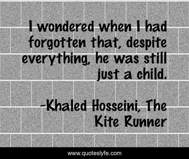 This page presents the quote "I wondered when I had forgotten that, despite everything, he was still just a child.". Author of this quote is Khaled Hosseini, The Kite Runner. This quote is about parenting, children,.