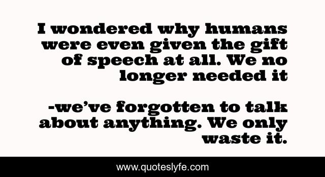 This page presents the quote "I wondered why humans were even given the gift of speech at all. We no longer needed it". Author of this quote is we’ve forgotten to talk about anything. We only waste it.. This quote is about human detritus, rasmenia massoud,.