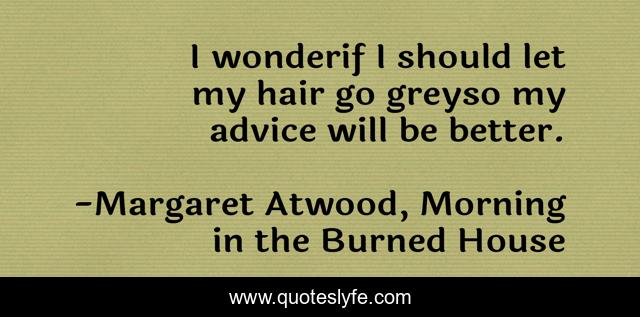 This page presents the quote "I wonderif I should let my hair go greyso my advice will be better.". Author of this quote is Margaret Atwood, Morning in the Burned House. This quote is about ageing, advice, grey-hair, wisdom,.