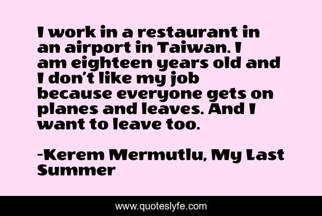 This page presents the quote "I work in a restaurant in an airport in Taiwan. I am eighteen years old and I don’t like my job because everyone gets on planes and leaves. And I want to leave too.". Author of this quote is Kerem Mermutlu, My Last Summer. This quote is about teen, coming-of-age, young-adult-fiction,.