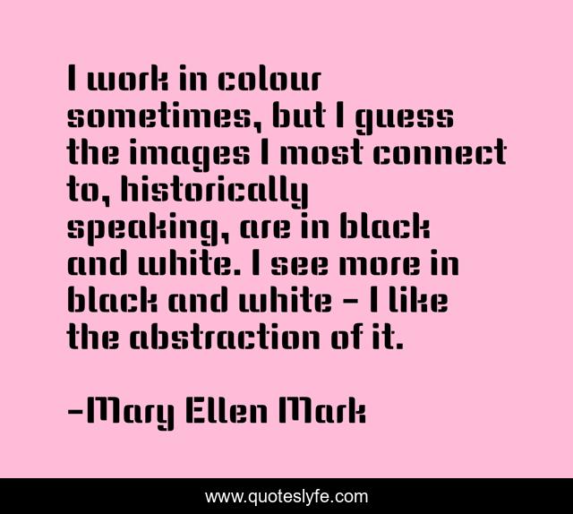 This page presents the quote "I work in colour sometimes, but I guess the images I most connect to, historically speaking, are in black and white. I see more in black and white - I like the abstraction of it.". Author of this quote is Mary Ellen Mark. This quote is about see, black, black and white,.