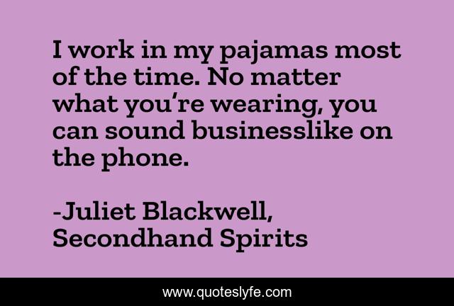 This page presents the quote "I work in my pajamas most of the time. No matter what you’re wearing, you can sound businesslike on the phone.". Author of this quote is Juliet Blackwell, Secondhand Spirits. This quote is about work, pajamas, comfort, businesslike,.