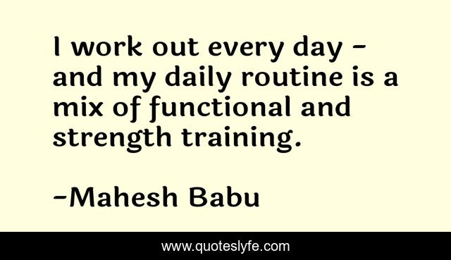 This page presents the quote "I work out every day - and my daily routine is a mix of functional and strength training.". Author of this quote is Mahesh Babu. This quote is about training, work, daily,.