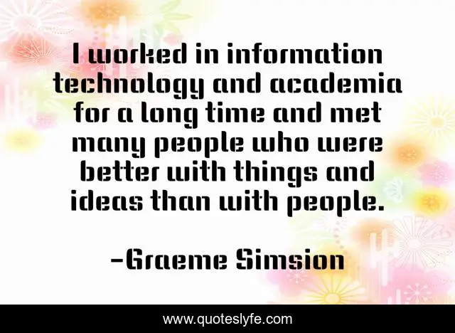 This page presents the quote "I worked in information technology and academia for a long time and met many people who were better with things and ideas than with people.". Author of this quote is Graeme Simsion. This quote is about time, ideas, people,.