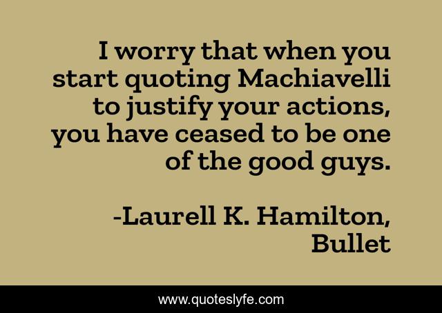 This page presents the quote "I worry that when you start quoting Machiavelli to justify your actions, you have ceased to be one of the good guys.". Author of this quote is Laurell K. Hamilton, Bullet. This quote is about anita-blake, vampires,.