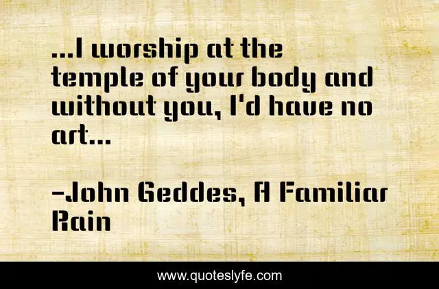 This page presents the quote "...I worship at the temple of your body and without you, I'd have no art...". Author of this quote is John Geddes, A Familiar Rain. This quote is about adoration, love, muse, temple, worship, affection,.