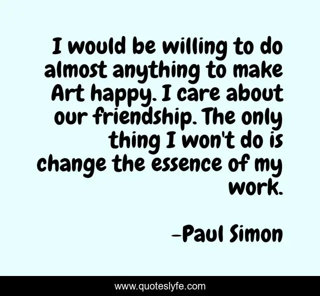 This page presents the quote "I would be willing to do almost anything to make Art happy. I care about our friendship. The only thing I won't do is change the essence of my work.". Author of this quote is Paul Simon. This quote is about work, art, change,.