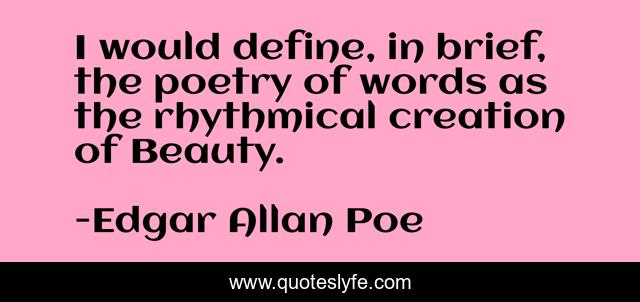 This page presents the quote "I would define, in brief, the poetry of words as the rhythmical creation of Beauty.". Author of this quote is Edgar Allan Poe. This quote is about creation, poetry, words,.