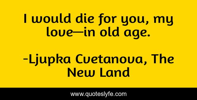 This page presents the quote "I would die for you, my love—in old age.". Author of this quote is Ljupka Cvetanova, The New Land. This quote is about aphorism, love, love-and-sayings, die, irony, old-age-saying, funny-humor, funny-but-true, die-for,.