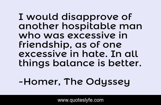 This page presents the quote "I would disapprove of another hospitable man who was excessive in friendship, as of one excessive in hate. In all things balance is better.". Author of this quote is Homer, The Odyssey. This quote is about aphorism, friendship,.