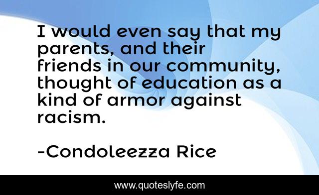 This page presents the quote "I would even say that my parents, and their friends in our community, thought of education as a kind of armor against racism.". Author of this quote is Condoleezza Rice. This quote is about friends, parents, community,.