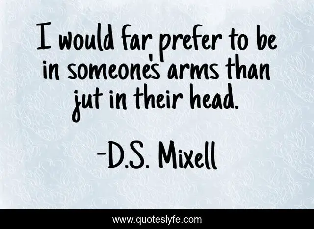 This page presents the quote "I would far prefer to be in someone's arms than jut in their head.". Author of this quote is D.S. Mixell. This quote is about head, love, rather, mind, memory, prefer, present-moment, holding, hugs,.