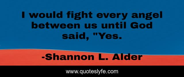 This page presents the quote "I would fight every angel between us until God said, "Yes.". Author of this quote is Shannon L. Alder. This quote is about longing, desperation, god-s-plan, god, romance, notebook, loving-you, dreaming, hope-for-future,.