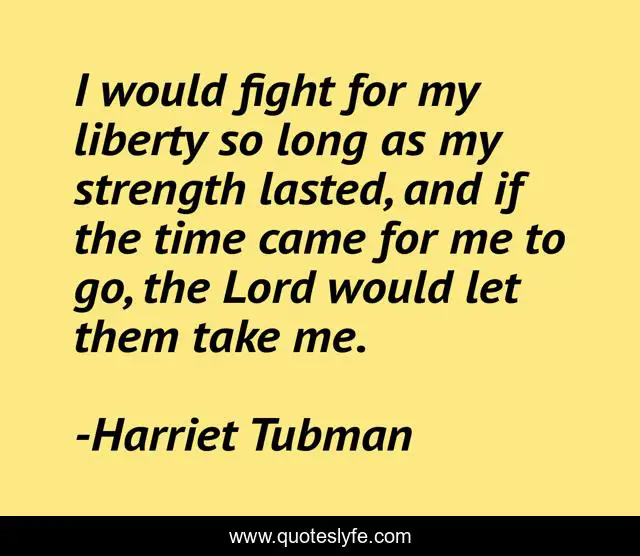 This page presents the quote "I would fight for my liberty so long as my strength lasted, and if the time came for me to go, the Lord would let them take me.". Author of this quote is Harriet Tubman. This quote is about me, time, fight,.