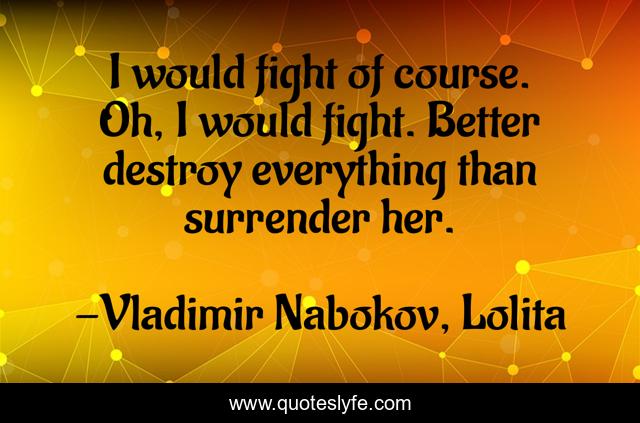 This page presents the quote "I would fight of course. Oh, I would fight. Better destroy everything than surrender her.". Author of this quote is Vladimir Nabokov, Lolita. This quote is about lust, possessiveness, obsession, obsessed, obsessions,.