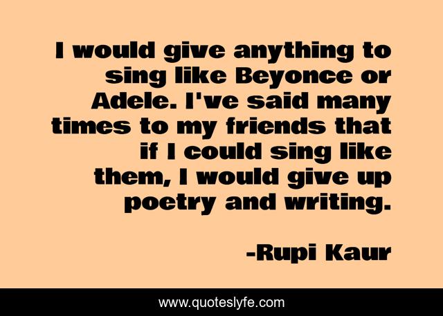 This page presents the quote "I would give anything to sing like Beyonce or Adele. I've said many times to my friends that if I could sing like them, I would give up poetry and writing.". Author of this quote is Rupi Kaur. This quote is about said, friends, writing,.