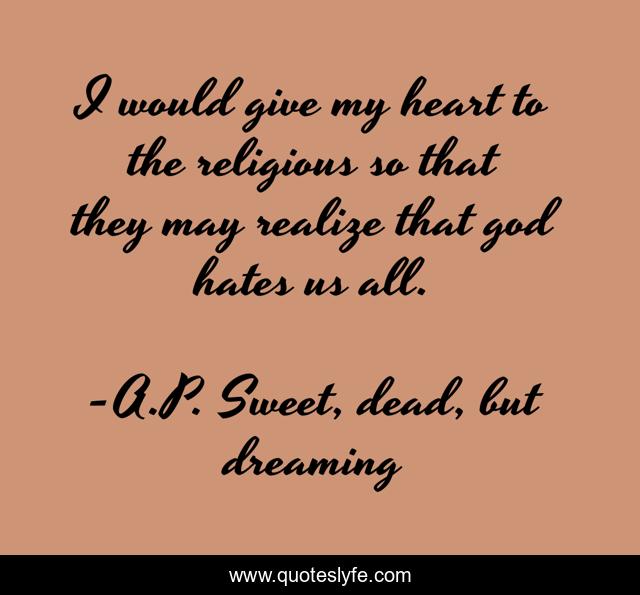 This page presents the quote "I would give my heart to the religious so that they may realize that god hates us all.". Author of this quote is A.P. Sweet, dead, but dreaming. This quote is about heart, god, hate, religion,.