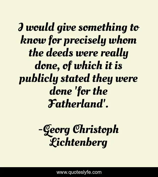 This page presents the quote "I would give something to know for precisely whom the deeds were really done, of which it is publicly stated they were done 'for the Fatherland'.". Author of this quote is Georg Christoph Lichtenberg. This quote is about politics, liberty, government,.