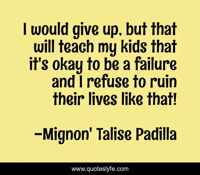 This page presents the quote "I would give up, but that will teach my kids that it's okay to be a failure and I refuse to ruin their lives like that!". Author of this quote is Mignon' Talise Padilla. This quote is about confidence-and-attitude, motivation, love, dream-big, business, positive, motivational, confidence, inspiring-moms,.