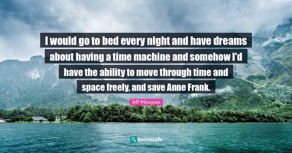 This page presents the quote "I would go to bed every night and have dreams about having a time machine and somehow I'd have the ability to move through time and space freely, and save Anne Frank.". Author of this quote is Jeff Mangum. This quote is about moving, dream, time and space, time machine, frank, ability, bed, night, every night,.