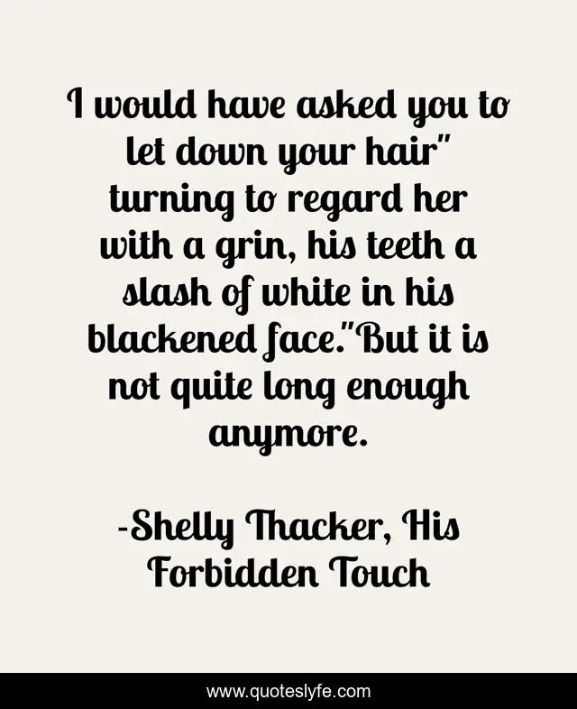 This page presents the quote "I would have asked you to let down your hair" turning to regard her with a grin, his teeth a slash of white in his blackened face."But it is not quite long enough anymore.". Author of this quote is Shelly Thacker, His Forbidden Touch. This quote is about romance, historical-romance,.