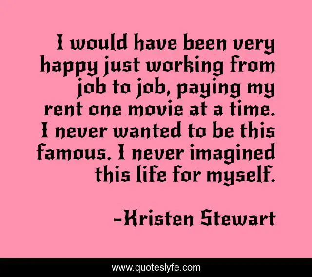 This page presents the quote "I would have been very happy just working from job to job, paying my rent one movie at a time. I never wanted to be this famous. I never imagined this life for myself.". Author of this quote is Kristen Stewart. This quote is about life, time, happy,.
