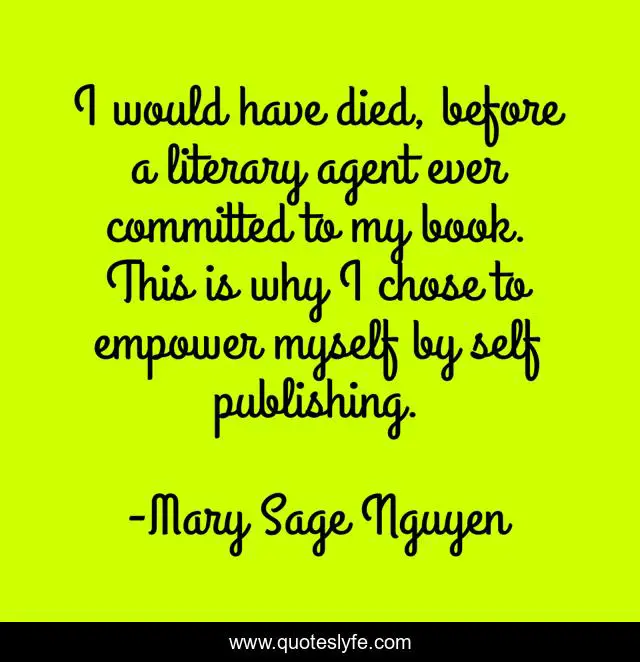 This page presents the quote "I would have died, before a literary agent ever committed to my book. This is why I chose to empower myself by self publishing.". Author of this quote is Mary Sage Nguyen. This quote is about literary-criticism, query-letters, book,.
